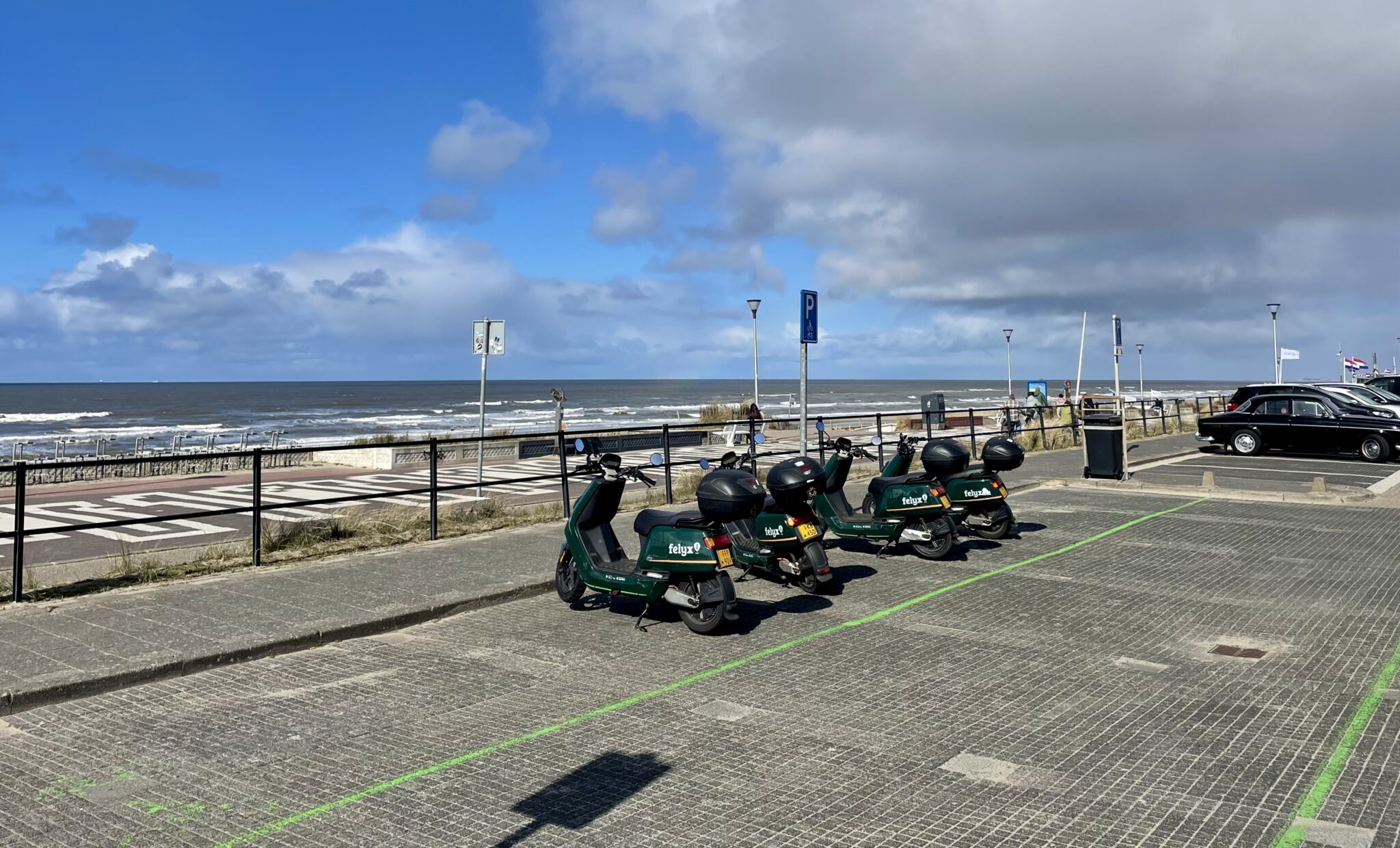Vier Felyx deelscooters op de boulevard van Zandvoort met de zee op de achtergrond